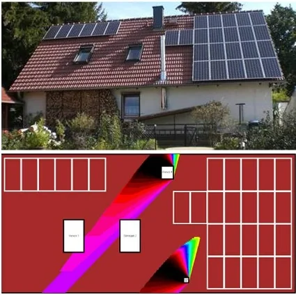 Die Herausforderung bei diesem Projekt bestand darin, die Verschattung durch die beiden Schornsteine zu berücksichtigen und die Module so zu platzieren, dass die Auswirkungen minimiert werden. Mithilfe eines Verschattungsprogramms haben wir die Verschattungsverläufe im Jahresverlauf simuliert und die optimale Positionierung der Module ermittelt. Die Planungsunterlagen zeigten bereits im Vorfeld, wie sich die Verschattung im August auf die Anlage auswirken würde, sodass wir die bestmögliche Lösung entwickeln konnten.